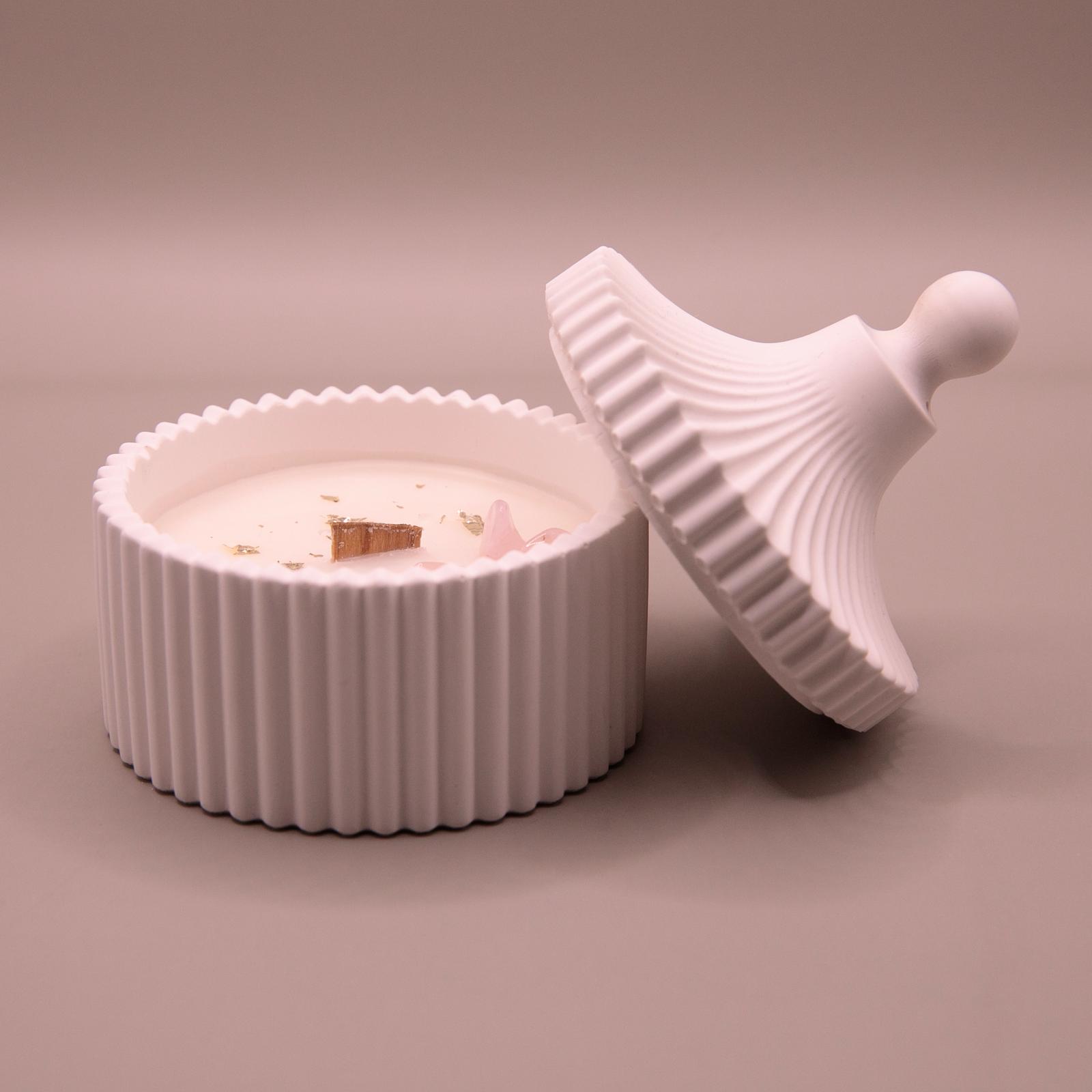 Candela in cera di soia con stoppino in legno, contenuta in un elegante barattolo in gesso lavorato. Dentro ci trovi: oro alimentare, cristalli e tanta energia positiva (più un profumo che ti fa venire voglia di vivere nudi tra i fiori).